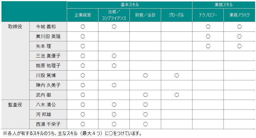 当社は経営戦略の実践にあたり、当社の取締役会が備えるべきスキルを「基本スキル」と「業務スキル」に分類しています。