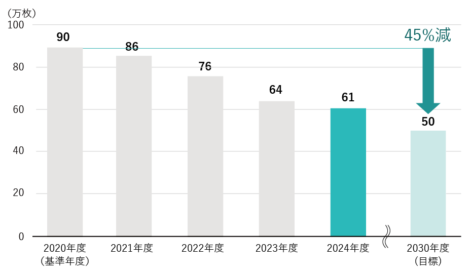 NSDは、業務プロセスのデジタル化を推進する中で、決裁書・申請書といった社内文書の電子化を進めており、紙ベースでの回覧・保管の必要性を可能な限り排除しています。また、ISO14001における取り組みの一環として、紙資源の使用に着目し、2020年度を基準として、2030年度までに印刷枚数を45%削減するという長期的な環境目標を設定しています。月次モニタリングや削減活動の共有を通じて、目標達成に向けた進捗を実現しています。